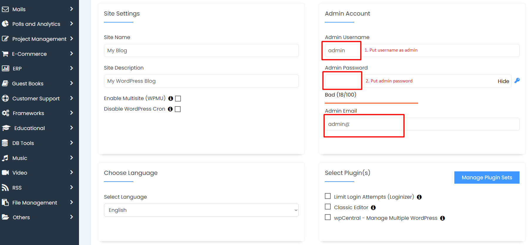 Admin Username: Choose the username to be used for the WordPress admin/wp-admin account