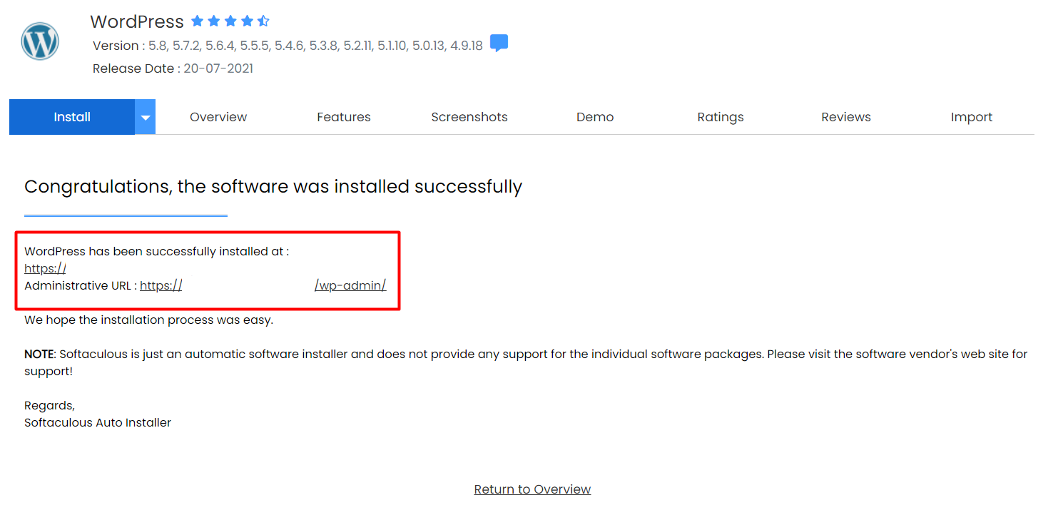 You will see the success messages and URL for access the WordPress admin panel as shown in the picture below when installation is completed: